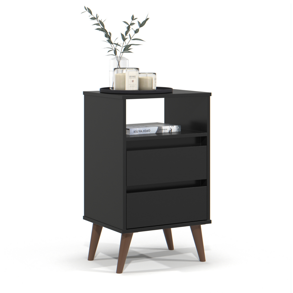 Posee 2 cajones dentro de los cuales podrás almacenar lo que mas gustes; sobre ellos una repisas para objetos de decoración o guardar lo que mas desees. Posee unas patas que entregan un estilo único en conjunto con sus rieles telescópicos que aportan una calidad superior.